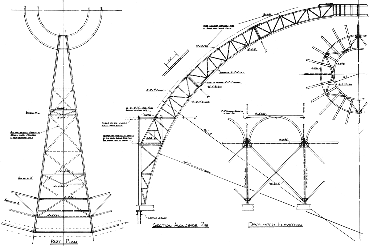 The dome, carried on an 11-ft high steel-framed drum, is constructed with 24 lattice ribs giving a purlin length of 11 ft and tied together at intervals of about 17 ft by light lattice girders. Domes have a tendency to spin, so to control this movement bracing is provided between two adjacent ribs in four sectors spaced 90 degrees apart. The 24 vertical legs of the drum portion are braced together in all bays and bolted to a ring of steel beams.