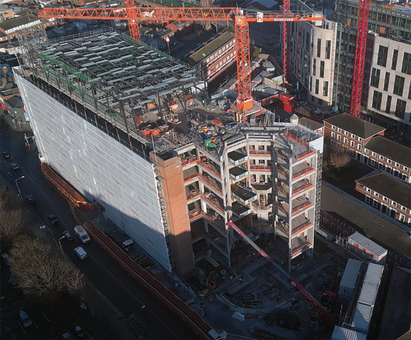 Fast forward to the current century, and another major refurbishment scheme has now commenced. The works involve main contractor PJ Hegarty & Sons adding two new office floors to the top of the structure, constructing mezzanine levels within the ground and first floor levels, and creating an additional bay around the 1980s-built atrium that is attached to the eastern end of the building. All-in-all, the redevelopment will provide more than 7,500m² of additional office floor space, within a new eight-storey building.