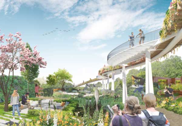 The Tree Line is said to offer exciting new viewpoints for visitors and creative opportunities for event organisers. Inspired by the stem and leaves of a plant, the structure includes a meandering walkway with separate viewing platforms and access ramps at each end. The design is based on a transportable length, fully prefabricated offsite so that it can be erected quickly on site.