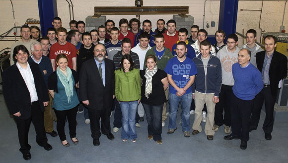 Andrew Mannion surrounded by staff and students of the DIT during the presentation and donation of a steel testing machine.