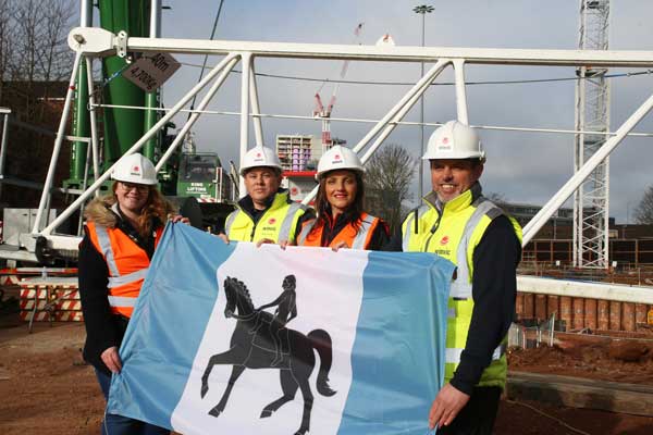 To celebrate the erection of the cranes and the start of construction, Coventry’s new flag – designed in celebration of the 2021 UK City of Culture – has been flown for the first time by being placed on one of the cranes.