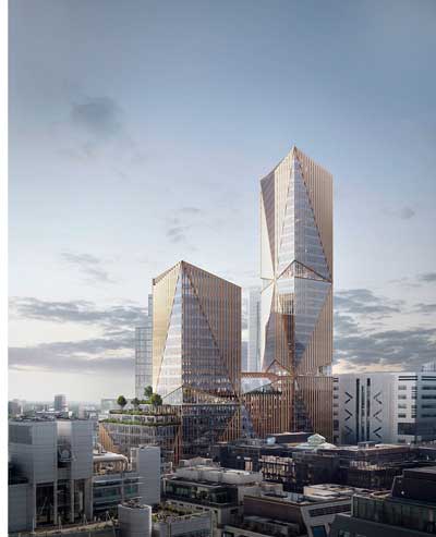 The scheme, which is being designed by Danish architect 3XN consists of a 12-storey podium with a 35-storey east tower and 20-storey western tower.