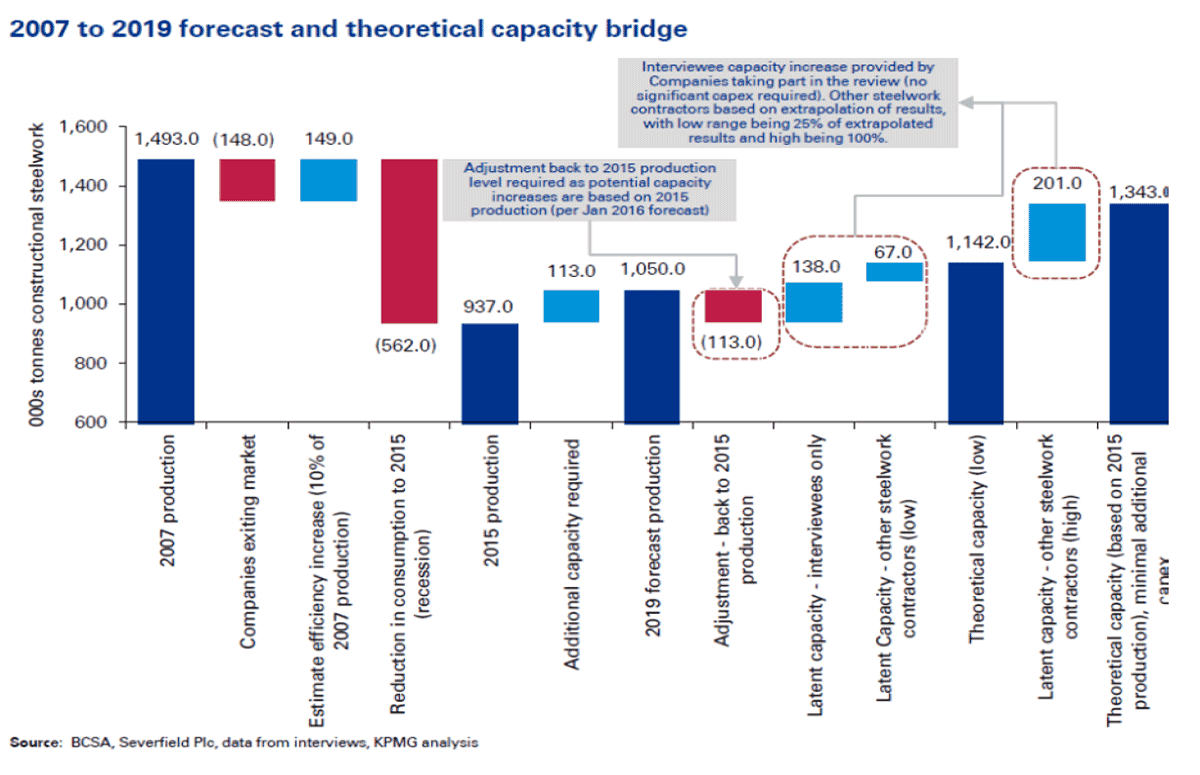 A report from KPMG concludes that UK steelwork contractors hold latent capacity of between 205,000t and 406,000t. The UK’s constructional steelwork capacity therefore lies between 1,142,000t and 1,343,000t against a forecast demand for constructional steelwork of 1,050,000t in 2019.