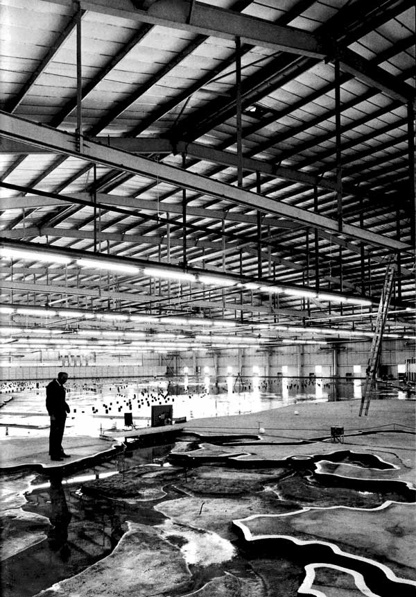 The main tied arch frames at 7·5m centres weigh approximately 12·5 tonnes each and were individually assembled on timbers over the floor slab and model area and hoisted into position with two cranes running along pre-arranged strips of the floor slab.