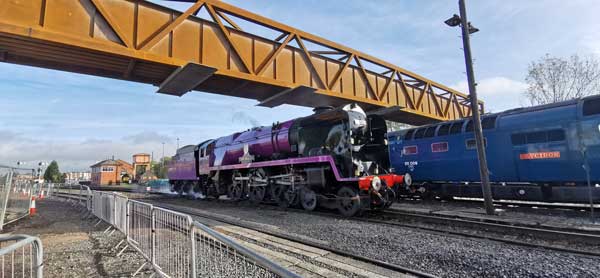 Weathering steel footbridge spans Kidderminster main line and heritage railway