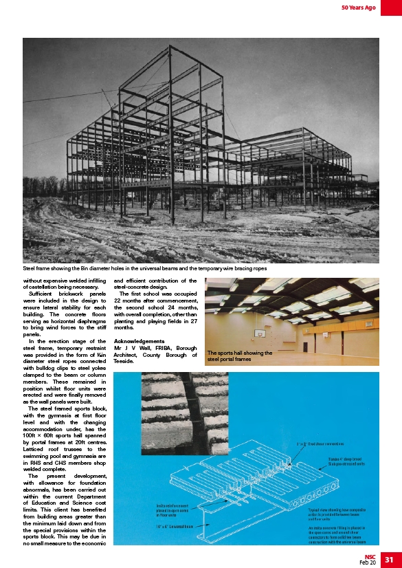 Steel frame showing the 8in diameter holes in the universal beams and the temporary wire bracing ropes