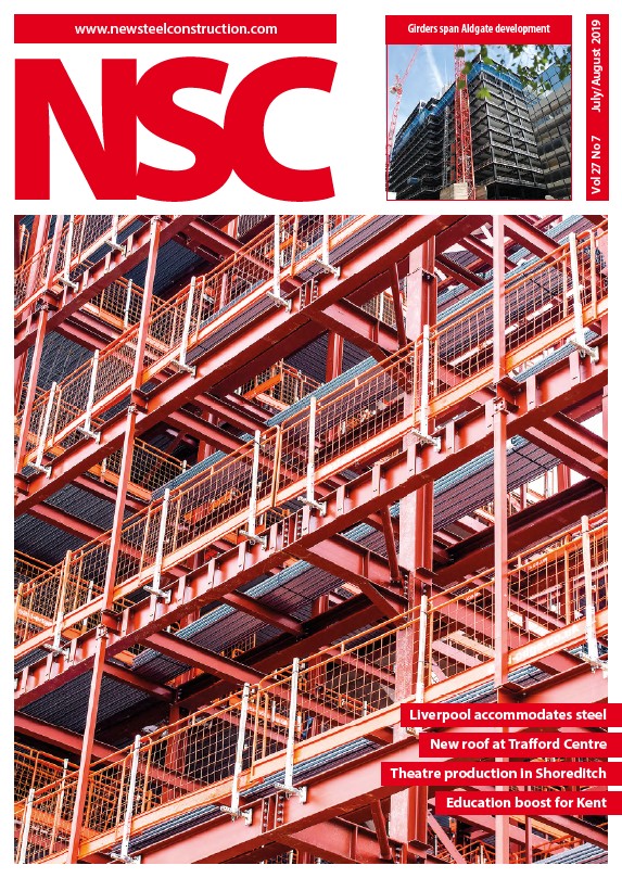 Vol 27 No 7 July/August 2019 www.newsteelconstruction.com Girders span Aldgate development Liverpool accommodates steel New roof at Trafford Centre Theatre production in Shoreditch Education boost for Kent