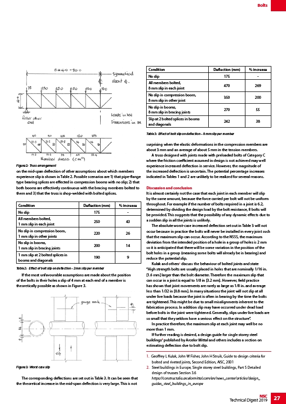 Table 2: Effect of bolt slip on deflection – 2mm slip per member